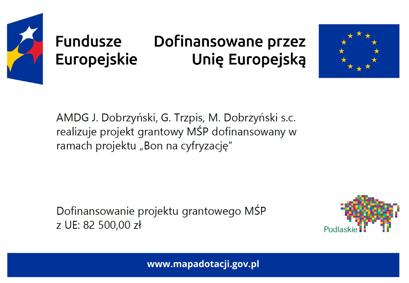 AMDG J. Dobrzyński, G. Trzpis, M. Dobrzyński s.c. realizuje projekt grantowy MŚP dofinansowany w ramach projektu „Bon na cyfryzację” w ramach programu Fundusze Europejskie dla Podlaskiego 2021-2027, Priorytet I Badania i innowacje, Działanie 1.2 Rozwój przez cyfryzację, Typ: Wdrażanie technologii cyfrowych w MŚP – bon na cyfryzację (projekt grantowy).
