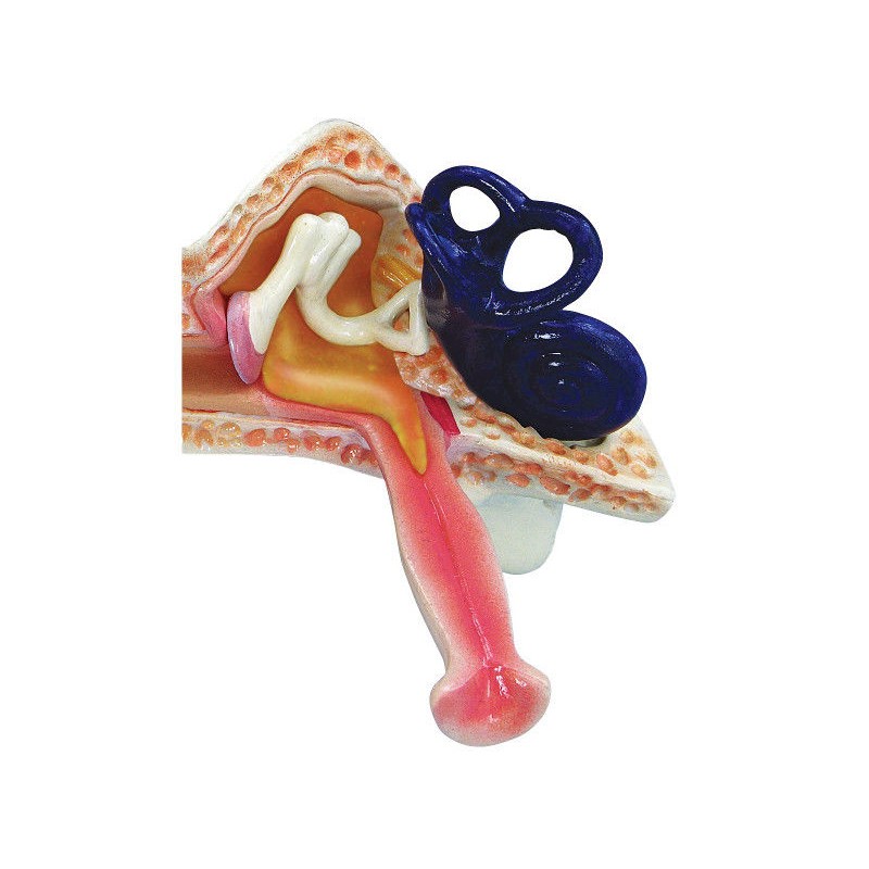 1019528 to powiększony model ucha dziecięcego o pełnym rozmiarze, który przedstawia półkoliste kanały i ślimak ucha wewnętrznego, kostki słuchowe,zapalenie ucha środkowego (zapalenie i symulowany płyn w uchu środkowym), błonę bębenkową, a także mięśnie bębenkowe. Model przedstawia również poziomą trąbkę słuchową Eustachiusza, typową dla dziecka.