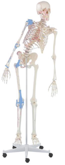 Szkielet posiada ruchome stawy: ramienny, biodrowy, skokowy. Na jednej stronie szkieletu przedstawiono więzadła stawowe kolano, biodro, łokieć, staw ramienny. Poszczególne stawy połączone ze sobą za pomocą gumy dzięki czemu umożliwiają demonstrację ruchomości. Model posiada w pełni ruchomy kręgosłup z nerwami rdzeniowymi i ruchome łopatki. Dyski międzykręgowe wykonane ze specjalnej pianki dzięki czemu bardzo zbliżone do naturalnych. Na jednej stronie szkieletu przedstawiono więzadła stawowe: kolano, biodro, łokieć, staw ramienny a także oznaczenia mięśniowe. Szkielet został umieszczony na 5 ramiennym stojaku.