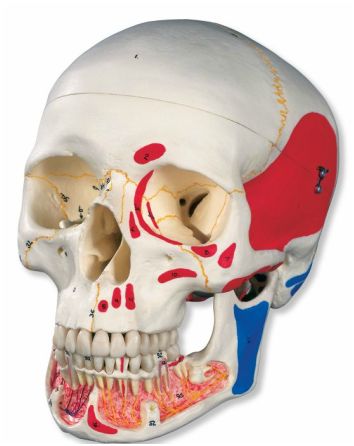 Wyjątkowa, 3 częściowa czaszka z odkrytą dolną szczęką i namalowanymi przyczepami mięśniowymi.