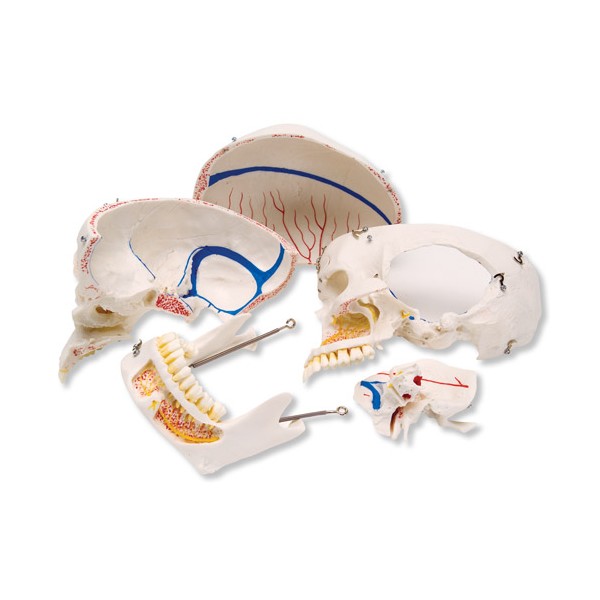 Model 10-częściowy ze zdejmowanym sklepienie czaszki. Podstawa dzielona w płaszczyźnie strzałkowej. Możliwość wyciągania pojedynczych zębów.