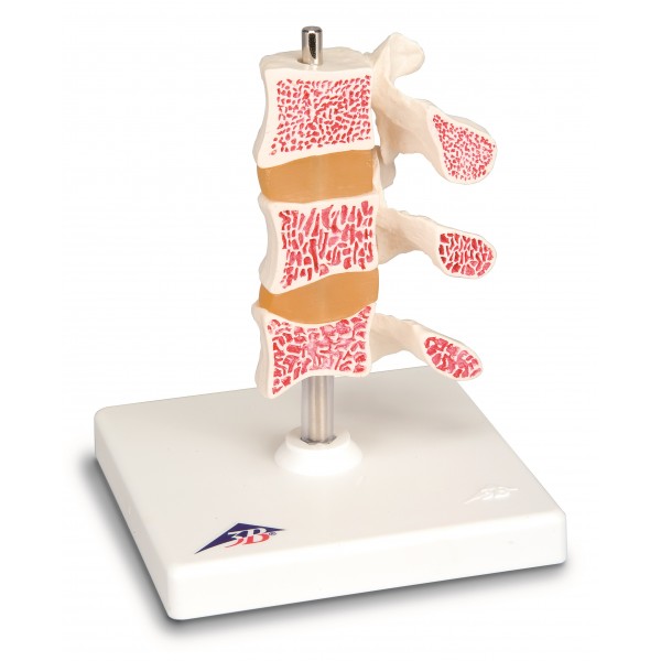 Najwyższej jakości model osteoporozy - 3 kręgi. Model dostarczany na demontowalnej podstawie. Składa się z 3 kręgów lędźwiowych z krążkami międzykręgowymi przedstawionych w przekroju środkowym.