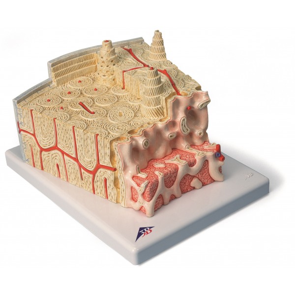 Model przedstawia w nadzwyczaj szczegółowych, trójwymiarowych przekrojach kość blaszkowatą i typowe struktury kości rurkowych powiększone 80 razy