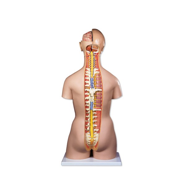 Wyjątkowy model swą unikatowość zawdzięcza otwartym plecom, odsłaniając tym samym wewnętrzną budowę od móżdżku po kość ogonową, tj.: kręgi, dyski międzykręgowe, rdzeń kręgowy, nerwy rdzeniowe, tętnice kręgowe i wiele innych cech przedstawionych w szczegółach. Wartościowe narzędzie pomagające wykładowcom oraz uczniom. Model dostarczany jest z instrukcją.