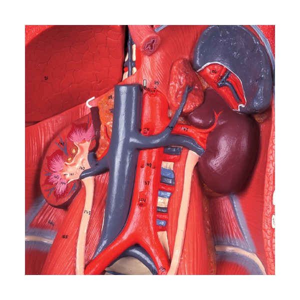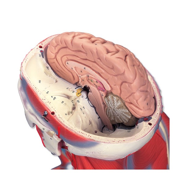Model mięśniowy Delux B50 to wysoki na 138 cm model, który przedstawia obraz powierzchniowej i wewnętrznej struktury mięśni, w szczegółowy sposób prezentuje główne nerwy, naczynia i narządy. Aż 45 części może być demontowanych, co pomoże Tobie lepiej zrozumieć podstawowe funkcje ludzkiego ciała. Gdy zdejmiesz sklepienie czaszki, zobaczysz wówczas 3 ruchome części mózgu. Pod wątrobą znajdziesz pęcherzyk żółciowy i drogi żółciowe. Opisywany model umożliwia obserwację płuc, żołądka, serca i nerek. Dostarcza szczegółowego widoku aż 13 różnych mięśni rąk i nóg! Do modelu załączone są narządów płciowe męskie i żeńskie, włącznie z gruczołami sutkowymi oraz szczegółowy podręcznik z nazwą ponad 600 anatomicznych detali. Ręcznie malowany, zmontowany na praktycznym statywie na kółkach.