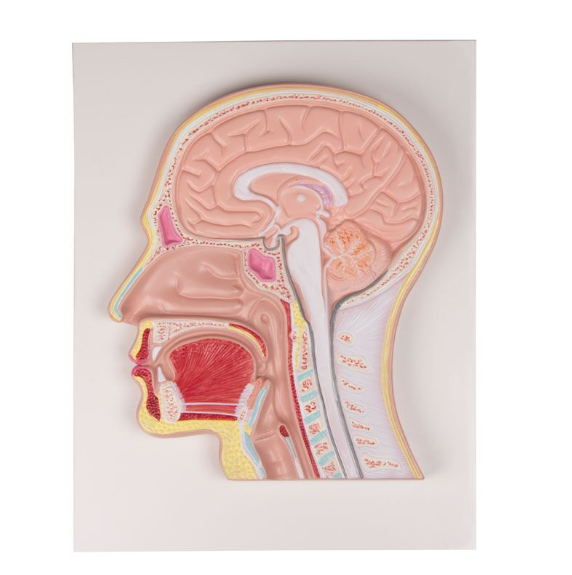Model przedstawia przekrój poprzeczny głowy pokazując powierzchowne i wewnętrzne struktury, dostarczany na podstawie.
