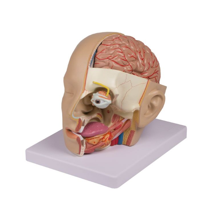 Model głowy 4 częściowy naturalnej wielkości, gdzie lewa strona twarzy przedstawiona jest w przekroju strzałkowym i horyzontalnym.