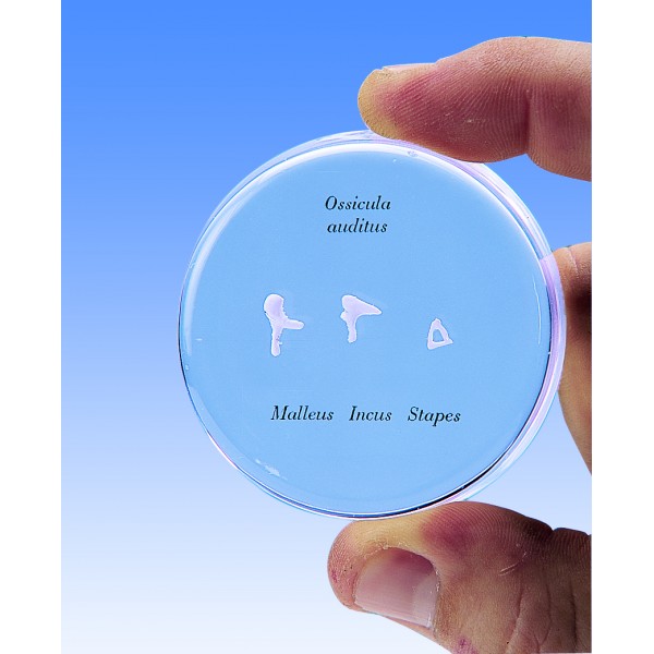 Kosteczki słuchowe w skali 1:1, oddzielone od siebie, zatopione razem w przezroczystym tworzywie i opisane.