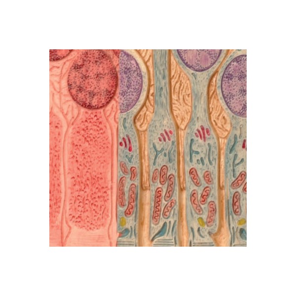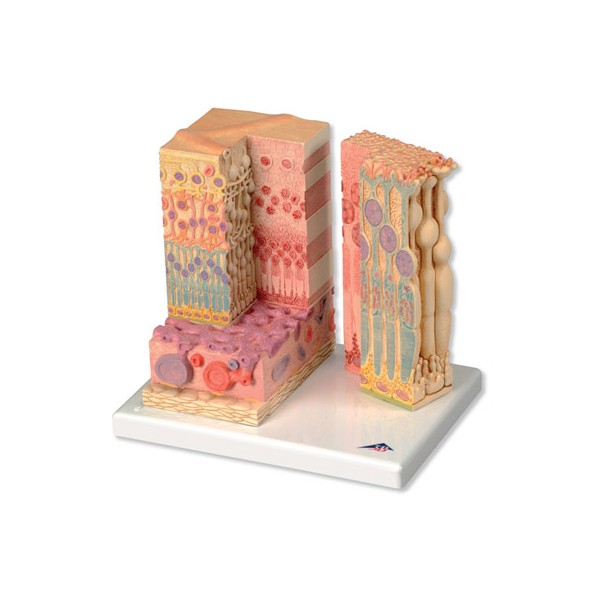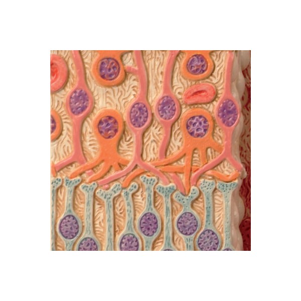 Mikroanatomia oka w prawej części jest przekrojem przedstawiającym strukturę mikroskopową fotoreceptorów oraz komórek warstwy pigmentowej. Lewa część to warstwowy model oka z siatkówką oraz warstwą twardówki.