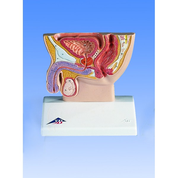 Miednica męska prezentuje przekrój środkowy miednicy przez męskie narządy płciowe przedstawia szczegółowo wszystkie elementy budowy anatomicznej.