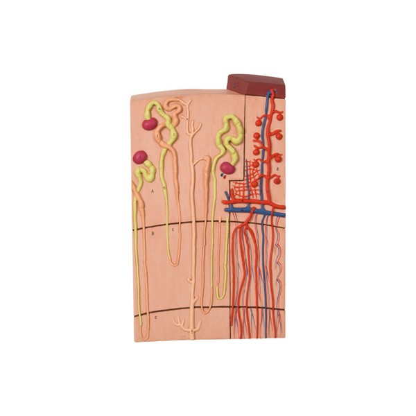 Model Nefronów i Naczyń Krwionośnych uwidacznia korę nerkową i rdzeń. Na modelu widoczne są ponadto ciałka nerkowe z kanalikiem proksymalnym i dystalnym, pętla Henlego, kanalik zbiorczy oraz naczynia krwionośne.