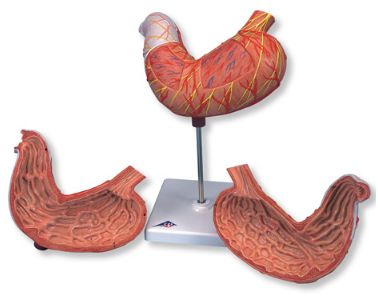 Model przedstawia różne warstwy ściany żołądka. Przednia połowa modelu jest zdejmowana.