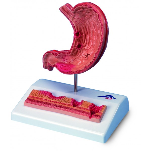 Przekrój żołądka z wrzodami przedstawia różne stadia zapalenia błony śluzowej żołądka od łagodnego wrzodu żołądka do perforacji. Model żołądka z przełykiem i dwunastnicą w przekroju zawiera następujące zmiany chorobowe: