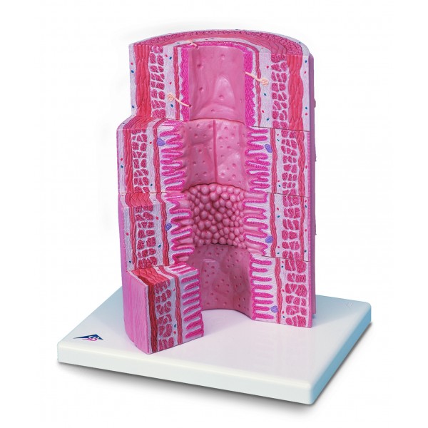 Przednia część modelu przedstawia w powiększeniu część histologiczną indywidualnych elementów układu pokarmowego oraz struktury ich tkanek. Tylna część modelu przedstawia znacznie powiększone widoki interesujących pod względem dydaktycznym obszarów dotyczące każdego z 4 wybranych odcinków układu pokarmowego.