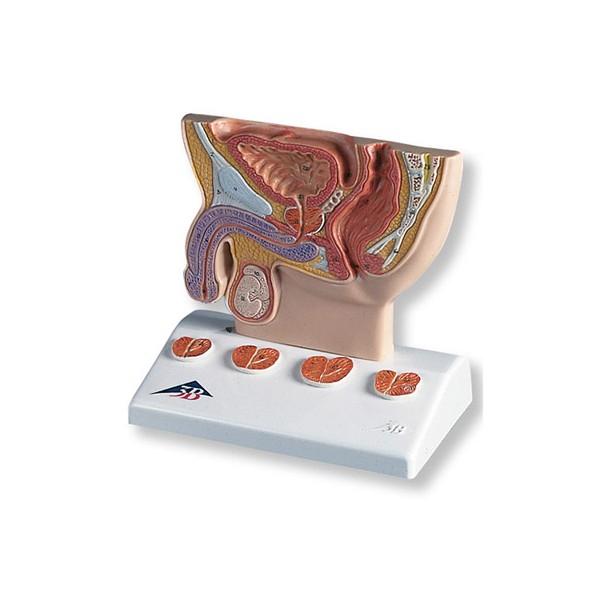 Prezentowany model prostaty ukazuje przekrój męskich organów płciowych. Obejrzymy na nim między innymi zdrową prostatę z torebką, cewkę moczową, jądro i odbytnicę. Wszystkie w skali odpowiadającej 1/2 ich rozmiaru naturalnego.