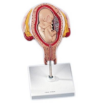 Realistyczny model przedstawia płód człowieka w 4 miesiącu ciąży w naturalnej pozycji w macicy. Płód można wyjąć z macicy w celu dokładniejszego wglądu do jej wnętrza.