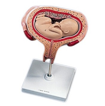 Realistyczny model przedstawia płód człowieka w 5 miesiącu ciąży w poprzecznej pozycji w macicy.