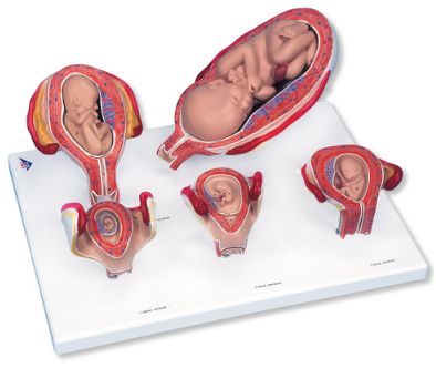 Model rozwoju płodu pokazuje najważniejsze etapy rozwoju zarodka i płodu. Wszystkie modele są zamontowane na podstawie. Model składa się z następujących elementów: * 1 Miesiąc -zarodek, * 2. Miesiąc- zarodek, * 3 miesiąc -zarodek, * 5 miesiąc- płód(miednicowego pozycji), * 7 miesiąc – płód. Specyfikacja techniczna: wymiary: 13x41x31 cm, masa: 2,1 kg.