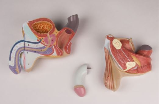Męskie narządy płciowe naturalnych wymiarów model przedstawia przekrój strzałkowy męskich organów rozrodczych. Model składa się z 4 części.