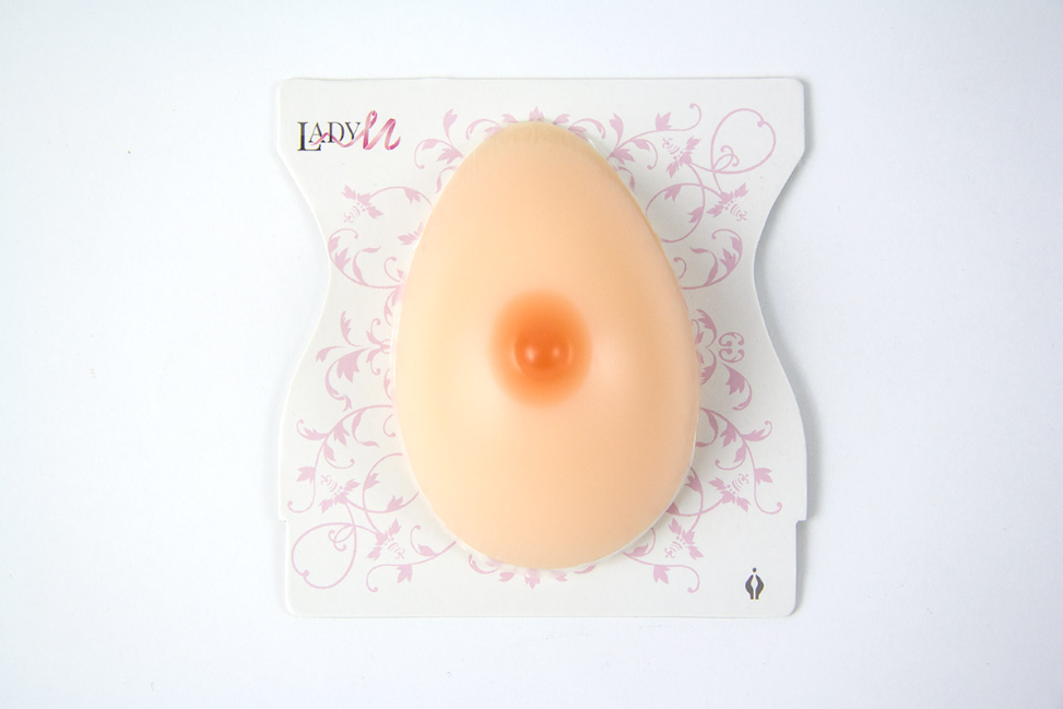 Duży model Lady M odpowiada naturalnej wielkości kobiecej piersi; miseczka C wykonany z półpłynnego silikonu medycznego, zawiera 3 guzki różnej wielkości.