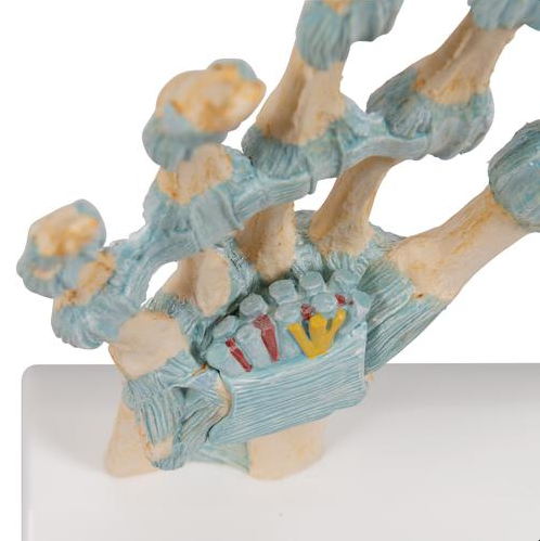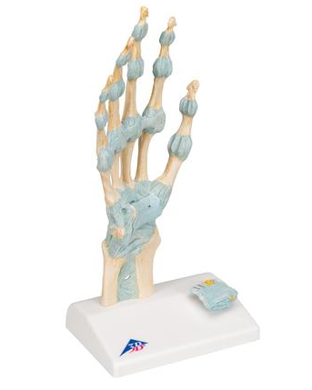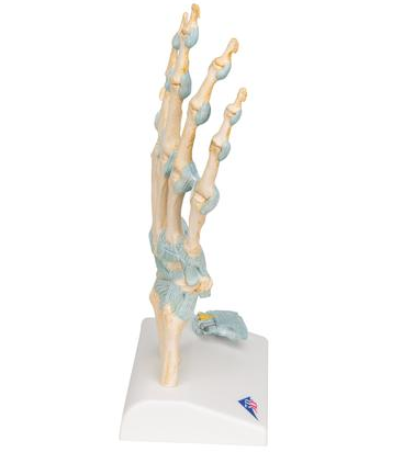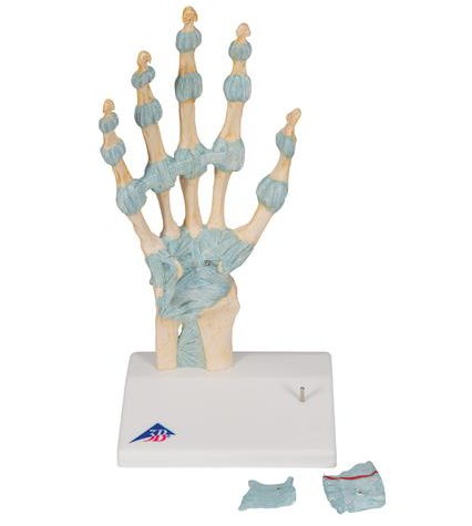 Szkielet ręki z więzadłami prezentuje detale budowy anatomicznej. 3 częściowy model szczegółowo przedstawia ważne klinicznie struktury nadgarstka, które dodatkowe mogą zostać zdemontowane.