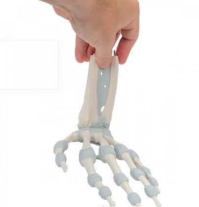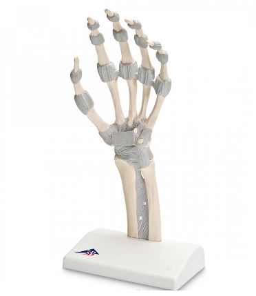 Model przedstawia dokładną anatomicznie budowę więzadeł dłoni. Idealnie nadaje się zarówno jako pomoc dydaktyczna oraz do wykorzystania podczas zajęć anatomii dla studentów medycyny, fizjoterapii czy terapii zajęciowej. Model przedstawia również struktury kostne kości nadgarstka, śródręcza, palców. W dystalnym obszarze przedramienia prezentowana jest również część koci promieniowej i łokciowej.