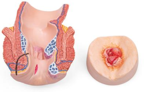 1. Pierwszy model przedstawia przednią część odbytnicy z hemoroidami, szczelinami odbytu i przetokami.