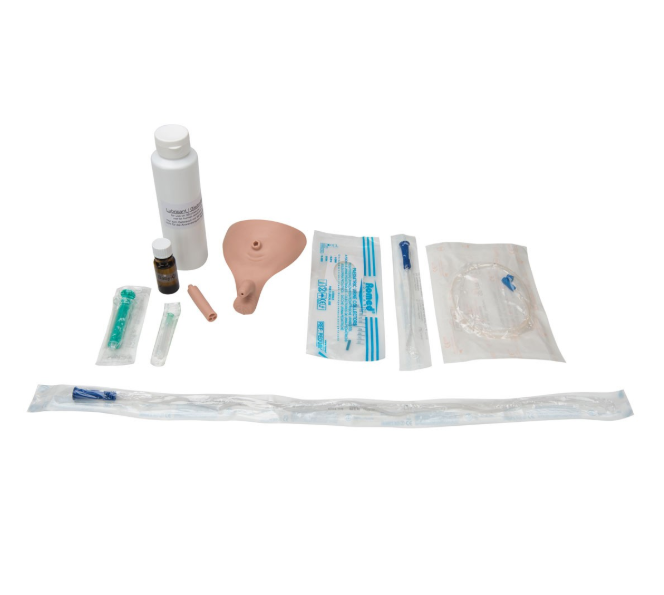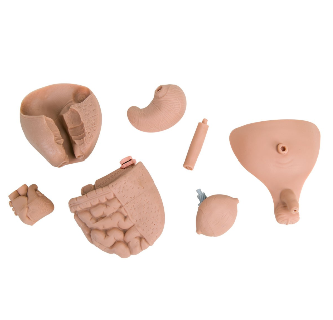 W skład zestawu wchodzą takie elementy jak: model noworodka, 2 wymienne ściany brzuszne z wkładami męskich oraz żeńskich narządów płciowych, 2 poduszki do wstrzyknięć w udo i biodro, pępowina, płuca, serce, żołądek, wkład wnętrzności, torba.