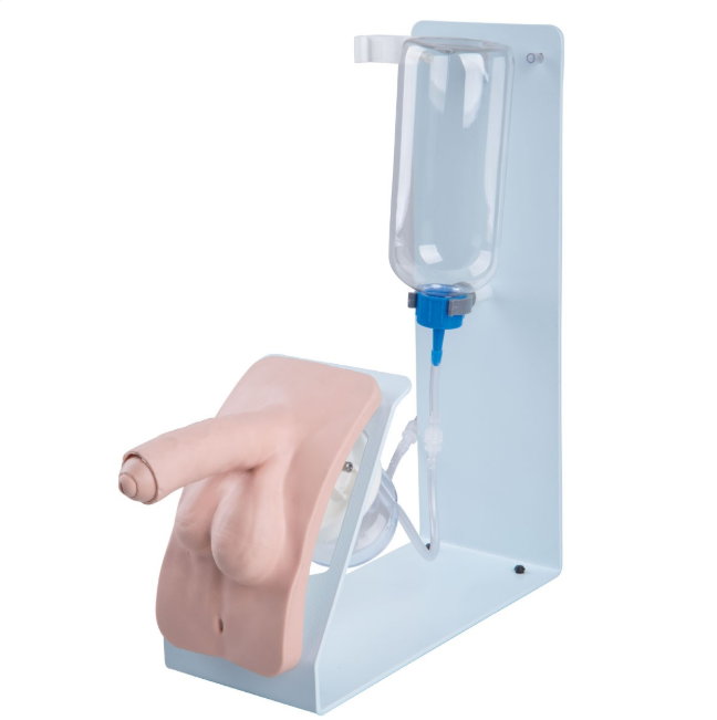 Model do cewnikowania Basic przeznaczony do nauki i treningu cewnikowania męskiego pęcherza moczowego. Dodatkowo wkładka płciowa umieszczona na stojaku przymocowana magnesami.