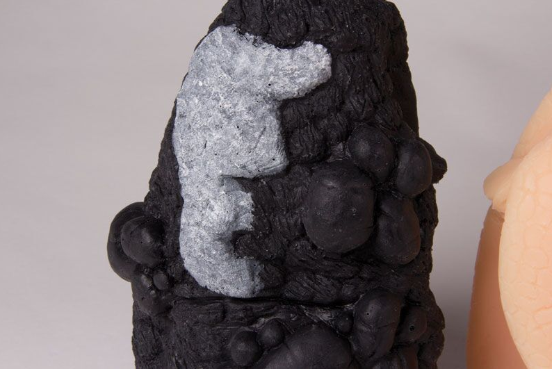 Płuco osoby palącej jest w kolorze czarnym, ma szarobiałe struktury nowotworowe i jest pokryte gąbczastymi bąblami spowodowanymi rozedmą. Model doskonale oddaje rzeczywistość i wywiera duże wrażenie.