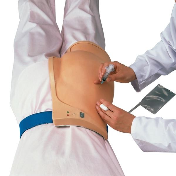 Symulator pośladkowy mocuje się na manekinie lub pacjencie za pomocą rzepów, umożliwia ćwiczenie wstrzyknięć domięśniowych. Poprzez sygnalizację świetlną i dźwiękową stwierdza prawidłowość wstrzyknięć. Struktura skóry bardzo trwała, nawet po wielu wkłuciach nie ma śladu zużycia. Wstrzyknięte płyny, odprowadzane są na zewnątrz.