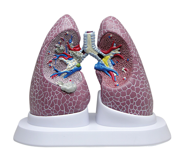 Naturalnej wielkości model przedstawia dwa osobne płuca wraz z przekrojami przedstawiającymi prawidłową anatomię oraz efekty przewlekłej obturacyjnej choroby płuc, nowotworu i astmy. Model płuc z patologiami.