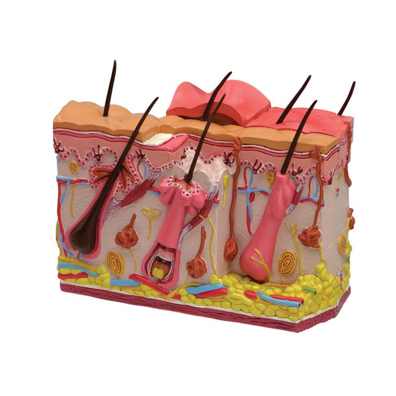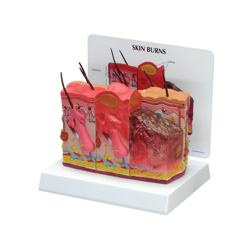 W33372 to wysokiej jakości, powiększony model prezentujący przekrój przez skórę zdrową oraz poparzoną z zaznaczeniem pierwszego, drugiego i trzeciego stopnia. Odwrotna strona ilustruje anatomię skóry.