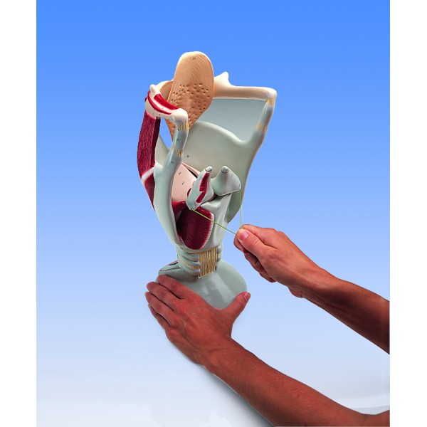 Powiększony funkcjonalny model krtani przedstawia w 4-krotnym powiększeniu krtań z kością gnykową. Z prawej stronie widoczne są struktury chrząstkowe, a z lewej mięśniowe. Struny głosowe, chrząstki nalewkowate oraz nagłośnia są ruchome w celu demonstracji ich funkcjonowania.