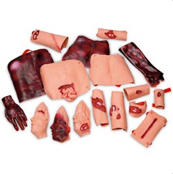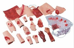 W skład zestawu symulacji ran wchodzi szereg krwawiących i niekrwawiących sztucznych ran oraz zbiorniczki na sztuczną krew z pompką montażową.