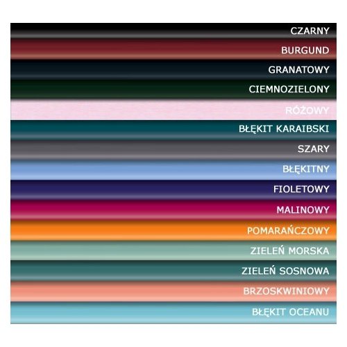 Dostępne kolory: Brzoskwiniowy, Burgund, Błekit Karaibski, Ciemnozielony, Czarny, Fioletowy, Granatowy, Jasnobłękitny, Malinowy, Pomarańczowy, Róż Perłowy, Szary, Zieleń Sosnowa.