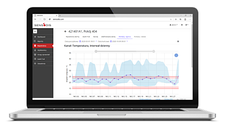 Tabele z pomiarami – możliwość komentowanie pomiarów oraz drukowania raportów za dowolny okres. Każdy rekord zawiera czas pomiaru, wartość oraz jednostkę. Pomiary można zapisać w formie pdf lub do arkusza kalkulacyjnego. Wykresy z pomiarami – możliwość śledzenia trendów na osi czasu. Powiększanie dowolnych obszarów wykresu. Wszystkie kanały pomiarowe danego rejestratora znajdują się na jednym wykresie. Automatyczne skalowanie wykresu w celu optymalnej prezentacji pomiarów oraz poziomych linii alarmowych.