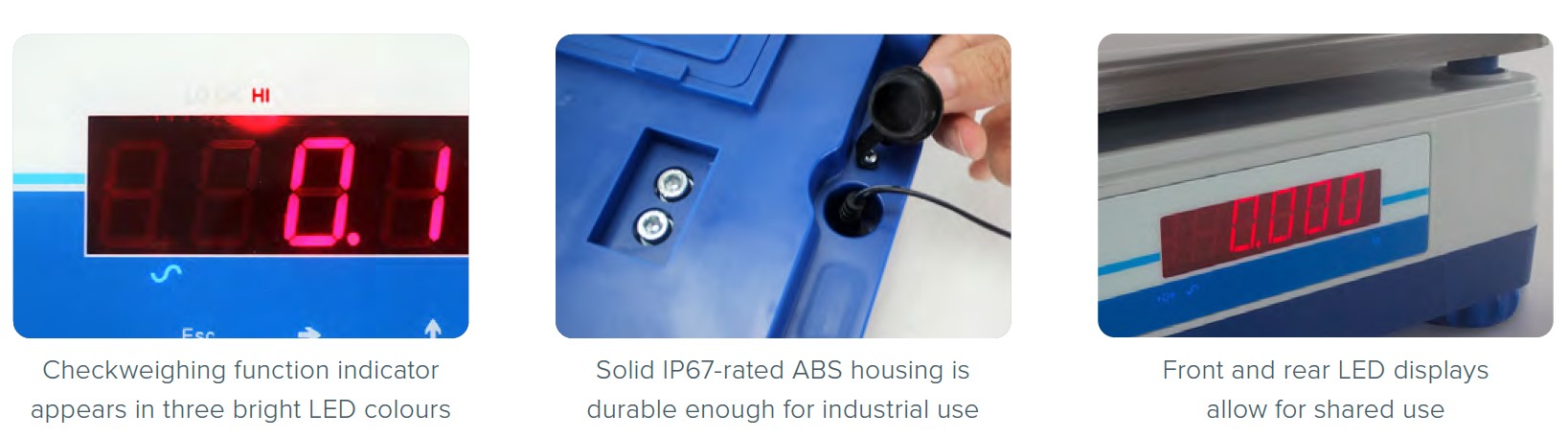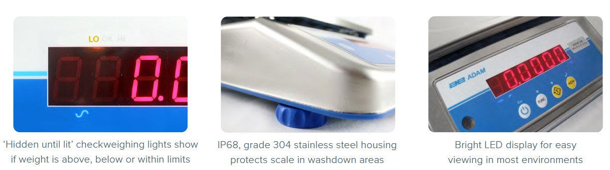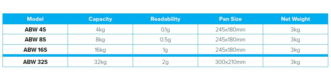 Zaprojektowane z myślą o zastosowaniach wymagających częstego mycia, wagi Aqua ABW są dostępne w następujących wersjach różnych zakresach ważenia i odczytu. Wagi ABW oferują stopień ochrony IP67 i są wyposażone w szalkę ze stali nierdzewnej, która jest odporna na wymagające środowiska przemysłowe i przetwórstwa spożywczego.