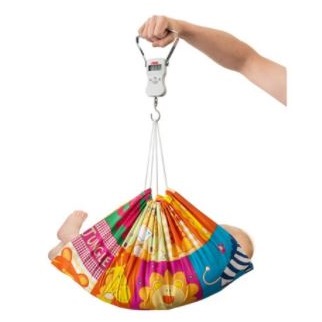 Mała i praktyczna waga wykonana ze stali. Zintegrowana taśma pomiarowa, ręczny chwyt oraz szelki dla dziecka.