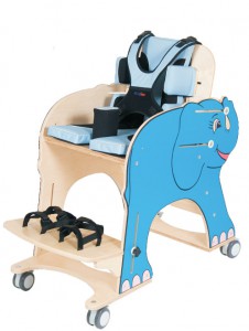 Fotelik rehabilitacyjny SŁONIK służy do wstępnej pionizacji dzieci w pozycji siedzącej. Prosty w budowie i obsłudze, a zarazem bardzo funkcjonalny, kolorowy. Wykonany z ekologicznego drewna, przyjazny dziecku, jak i środowisku. Mimo swojej prostoty w budowie doskonale spełnia swoją funkcję. Bezpiecznie mogą go używać zarówno dzieci spastyczne, jak i bardzo wiotkie o zmniejszonym napięciu mięśniowym. Regulowane peloty boczne pomagają korygować wady postawy. Urządzenie znajduje swoje zastosowanie w następujących jednostkach chorobowych: mózgowe porażenie dziecięce, niedowład kończyn dolnych (parapareza), porażenie kończyn dolnych (paraplegia), porażenie czterokończynowe (tetraplegia), niedowład czterokończynowy (tetrapareza), urazy wielonarządowe, zaawansowane choroby demielinizacyjne, przepuklina oponowo-rdzeniowa, stany po urazach kręgosłupa – odcinka lędźwiowego, piersiowego, szyjnego. Wyposażenie: stelaż z kołami jezdnymi wyposażonymi w hamulce, poduszka siedziska, poduszka oparcia pleców, peloty boczne podtrzymujące klatkę piersiową, peloty boczne podtrzymujące biodra, kamizelka, klin międzyudowy, podnóżek z paskami stabilizującymi stopy.