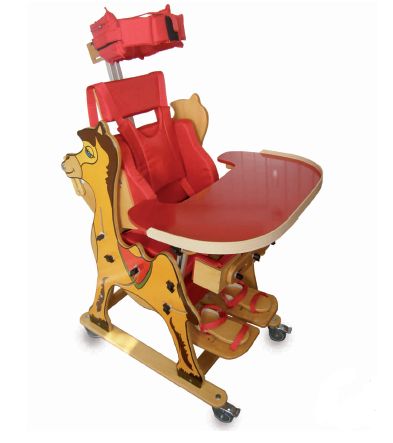Pionizator, który posiada funkcję fotelika rehabilitacyjnego.Może być stosowany dla dzieci z mózgowym porażeniem lub z innymi schorzeniami uniemożliwiającymi samodzielne siedzenie i stanie. Pamiętajmy, że możliwość korekcji postawy, przyczynia się do eliminacji napięć i przykurczów mięśni. Pionizator WIELBŁĄD jest urządzeniem bardzo uniwersalnym, można w nim sadzać jak również pionizować dzieci bardzo wiotkie oraz dzieci z problemami dużych napięć mięśniowych. Jego uniwersalność wynika z szerokiego zakresu regulacji.Zastosowanie drewna, kolorowej tapicerki, żywych kolorów, sympatycznej postaci wielbłąda sprawia, że dzieci przyjmują pionizator bardziej jak zabawkę niż sprzęt rehabilitacyjny. Urządzenie można stosować w następujących jednostkach chorobowych: mózgowe porażenie dziecięce; paraparezy; paraplegie; tetraplegie; tetraparezy; choroby zwyrodnieniowe ośrodkowego układu nerwowego; urazy wielonarządowe; porażenie kończyn dolnych; porażenie czterokończynowe; stwardnienie rozsiane; zaawansowane choroby demielinizacyjne; czwarty okres choroby reumatycznej; dziecięce porażenie mózgowe; przepukliny oponowo rdzeniowe; złamania kręgosłupa z porażeniami; stany po urazach kręgosłupa - odcinka lędźwiowego, piersiowego, szyjnego. Rozmiar 1: waga (max) - 25 kg; długośc podudzia (od kolan do stopy) 15-28 cm; szerokość bioder 14-21 cm; szerokość klatki piersiowej 14-21 cm; wzrost 70-100 cm.