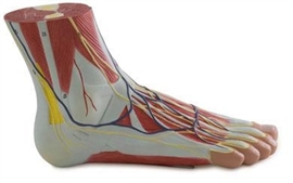 Naturalnego rozmiaru model. Rozcięgno podeszwowe i zginacz krótki jest wyjmowany w celu ukazania układu mięśni, ścięgien, naczyń i nerwów. Głębsze rozcięcie podeszwy pozwala na obserwację części mięśnia podeszwowego oraz odgałęzień nerwu podeszwowego. Grzbietowy przekrój ukazuje układ więzadeł wraz z nerwami i naczyniami.