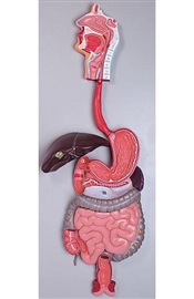 Naturalnych rozmiarów model przedstawiający przewód pokarmowy wraz z gruczołami. Jama ustna, gardło i pierwszy odcinek przełyku są rozkrojone wzdłuż płaszczyzny przyśrodkowo-strzałkowej. Wątroba pokazana jest z woreczkiem żółciowym, a trzustka jest rozkrojona w celu ukazania struktury tego gruczołu, żołądek jest otwarty wzdłuż przedniej płaszczyzny. Dwunastnica, jelito ślepe, część jelita cienkiego i odbytnica są przekrojone w celu ukazania ich budowy wewnętrznej. Odźwiernikowa część żołądka, fragment dwunastnicy z trzustką i lewy łuk okrężnicy poprzecznej są zdejmowane.