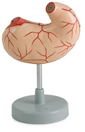 Naturalnego rozmiaru model żołądka rozkrojony wzdłuż środkowej płaszczyzny w celu ukazania jego wewnętrznej budowy wraz z błoną śluzową i odźwiernikiem. Przekrój ściany ukazuje warstwy mięśni okrężnych i wzdłużnych. Model przedstawia też nerwy i główne naczynia krwionośne żołądka. Model umieszczony jest na stojaku z podstawą.