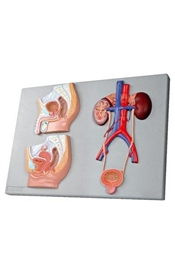 Model przedstawia budowę układu wydalniczego człowieka oraz topografię głównych naczyń krwionośnych. Przekrojona nerka i pęcherz moczowy dają wyobrażenie struktury wewnętrznej tych organów. Przekrój środkowy miednicy męskiej i żeńskiej daje możliwość obserwacji układu drogi wyprowadzającej mocz i topografii narządów płciowych w stosunku do innych organów w obrębie miednicy.