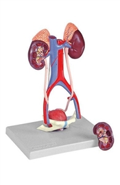 Naturalnych rozmiarów 5-częściowy model przedstawia główne komponenty systemu moczowego, żyłę główną i aortę brzuszną; prawa nerka jest rozcieta w celu ukazania kory, rdzenia, piramid, kielichów nerkowych, miednicy i początku tętnicy nerkowej i żyły.