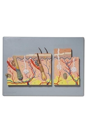70- krotnie powiększony model porównuje część owłosioną skóry do części bez włosów. Wszystkie struktury, w tym wrażliwe krwinki, mieszki włosowe, sebacoeus i gruczoły potowe, są pokazane szczegółowo.
