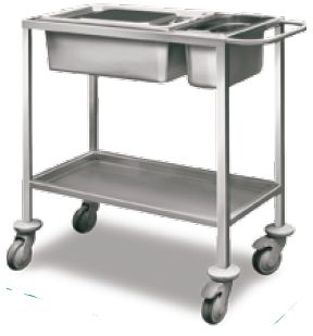 Stolik do materiałów medycznych i narzędzi chirurgicznych. W górnym blacie umieszczone 2 wyjmowane pojemniki wykonane ze stali kwasoodpornej. Przeznaczony do gromadzenia instrumentów chirurgicznych i materiałów opatrunkowych podczas zabiegów oraz do gromadzenia zużytych instrumentów. Średnica kółek: 80 mm.