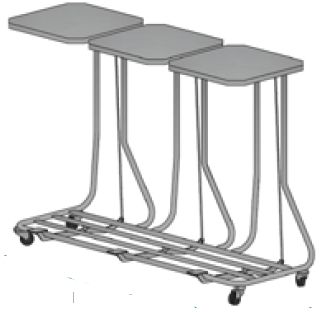 Wózek potrójny na worki foliowe bez pokrywy. Podstawa z kółkami o średnicy 50 mm, dwa kółka z blokadą. Pojemność: 120 l.