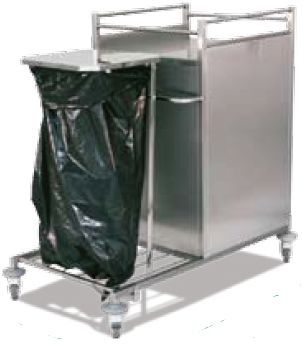 Wózek do przewożenia czystej i brudnej bielizny z dwoma półkami, z pojedyńczymi drzwiami. Blat z relingami zabiezpieczającymi o wymiarach 600x600 mm. Z tyłu szafki uchwyt na worek foliowy o pojemności 120 l z pokrywą podnoszoną nożnie. Cztery kółka o średnicy 125 mm (2 z blokadą).